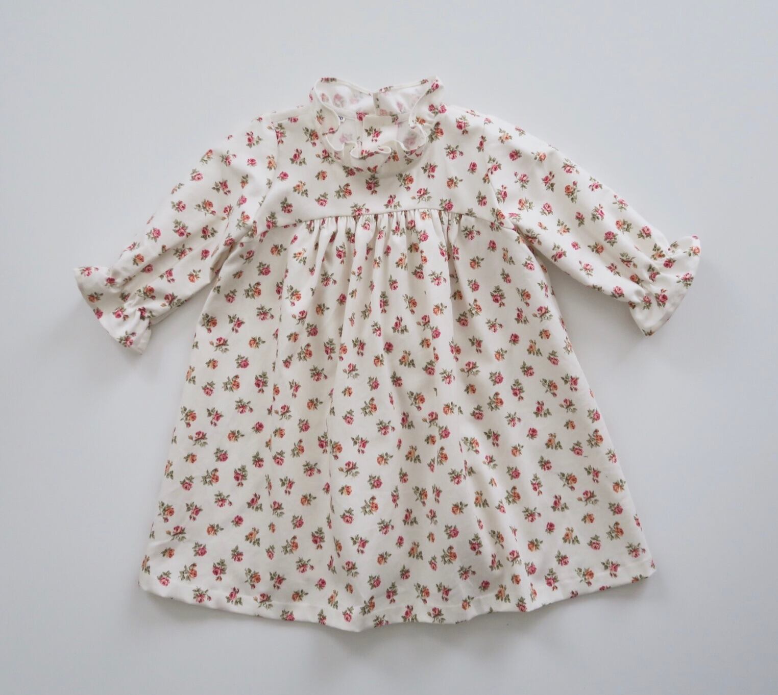 ご好評いただいているフリルワンピースをフラワープリントで作りました。