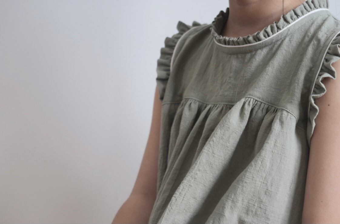 少しくすんだグリーンにオフホワイトのパイピングが印象的なセットアップです。