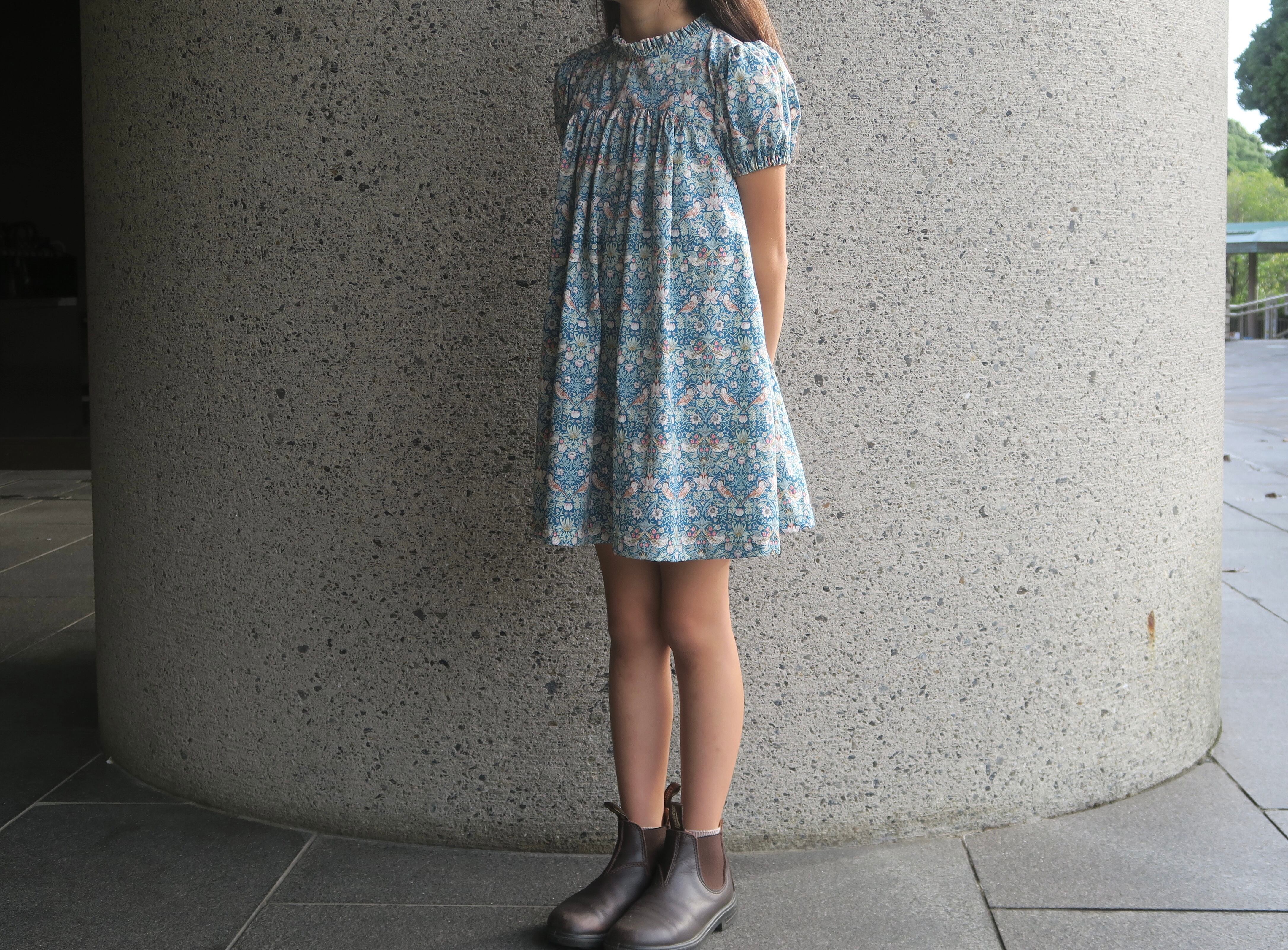 生地のクラシカルなデザインとパフスリーブ&襟フリルの甘めな雰囲気が◎
