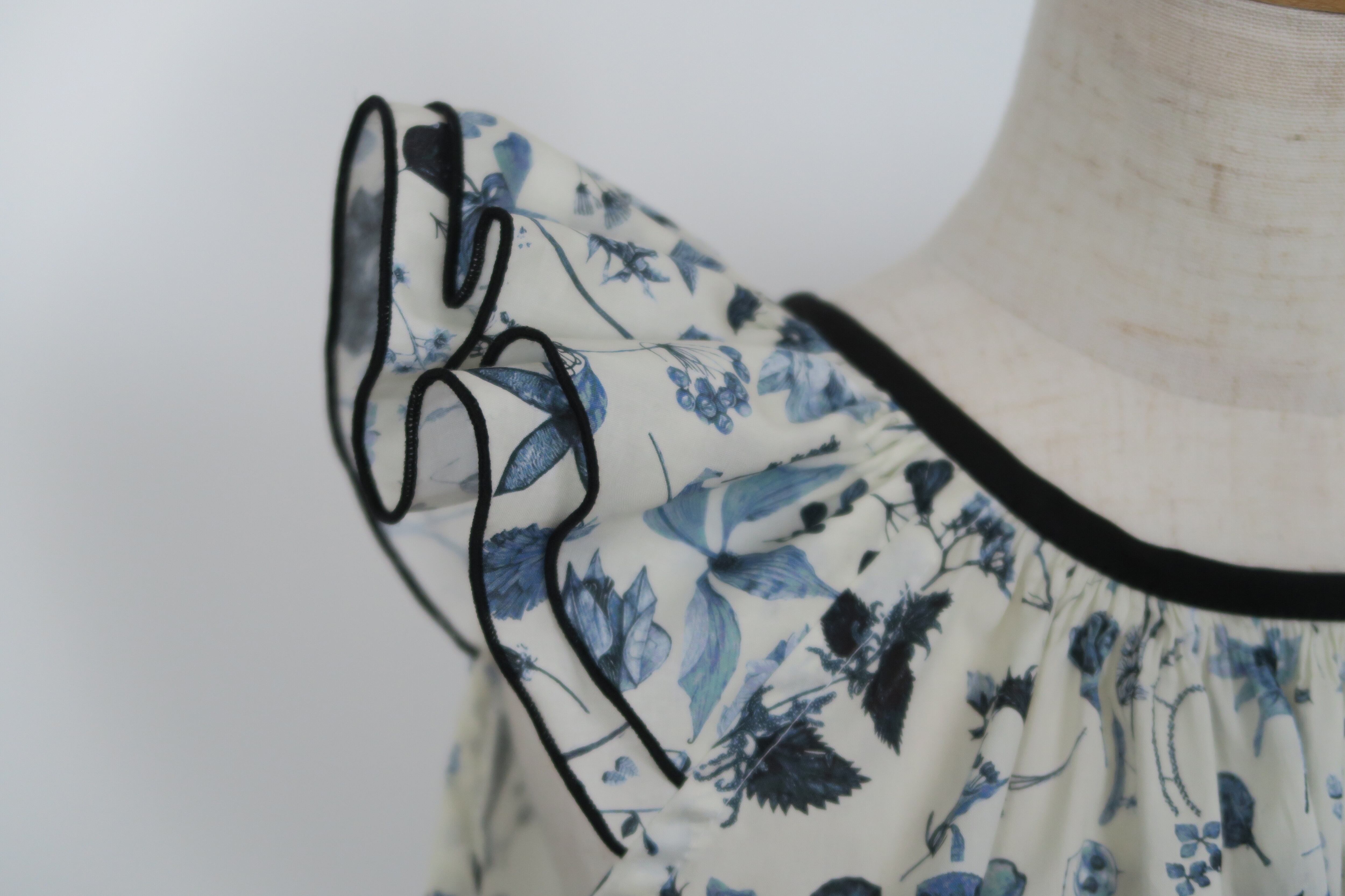 首元のパイピングとお袖の巻きロックはブラックでアクセントを付けました。