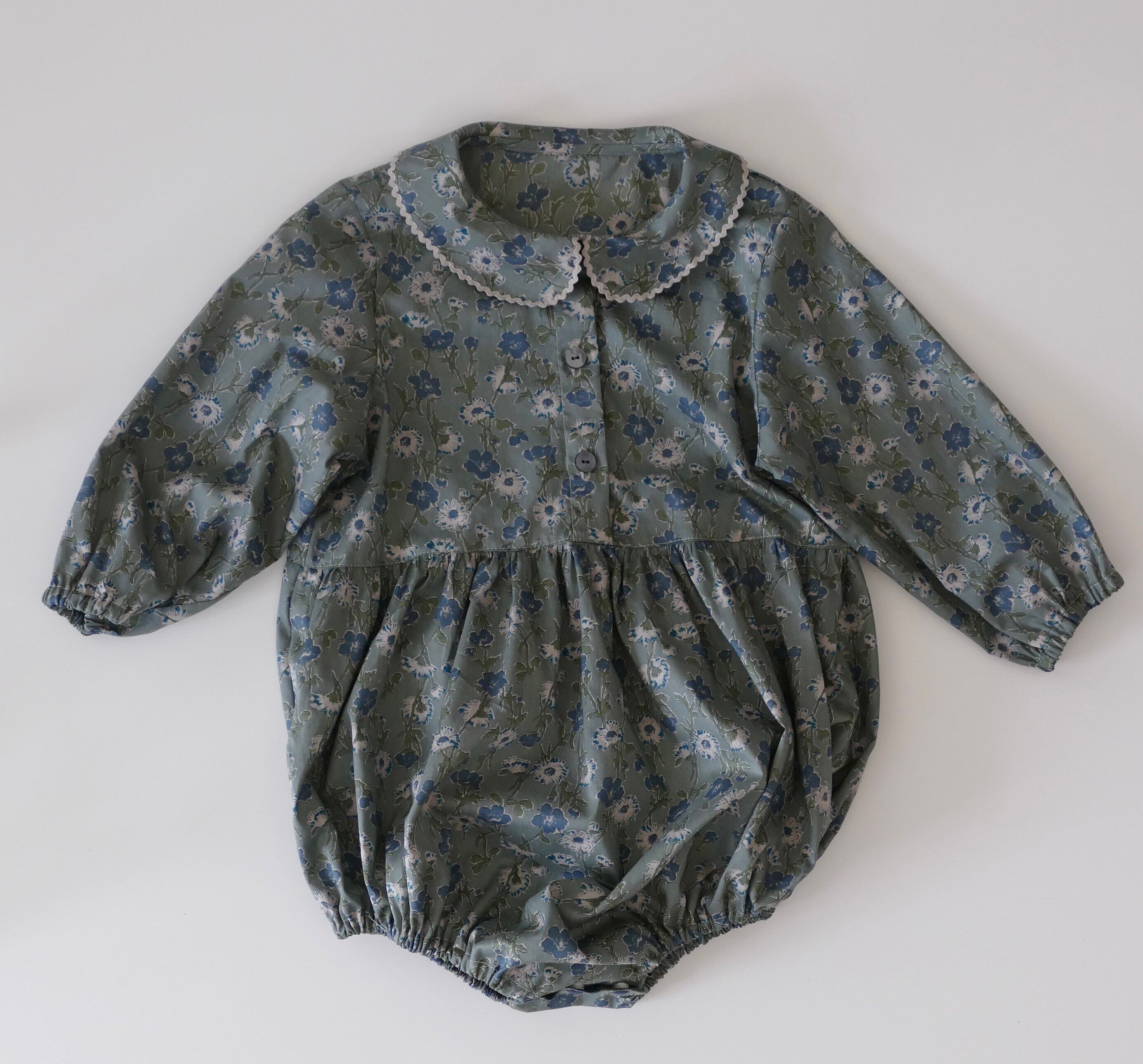 リバティプリントの生地を贅沢に使った丸襟のロンパース。